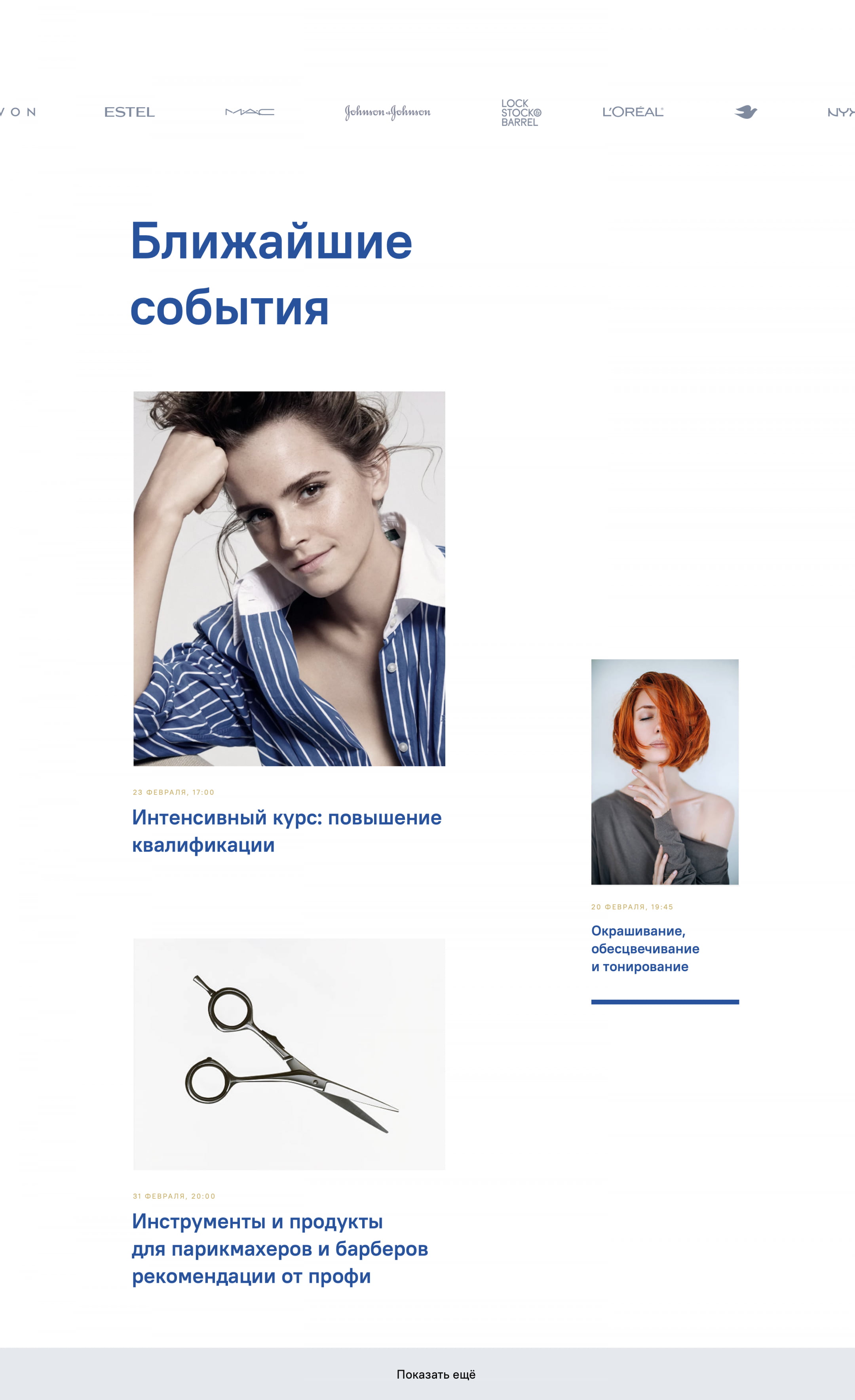 Сначала мобильныеИспользовали метод «Сначала мобильные». Требовалось показать самое важное в первую очередь и «небольшими порциями». Макет разделили на 3 части. На старте показываем одно из направлений. Это может быть слайдер с конкретным направлением или зацикленный ролик. Минимум информации — на этом экране мы пытаемся зацепить будущего колориста. Затем показываем буквально 3 ближайших события и за счёт нестандартной сетки и контраста направляем и вовлекаем.