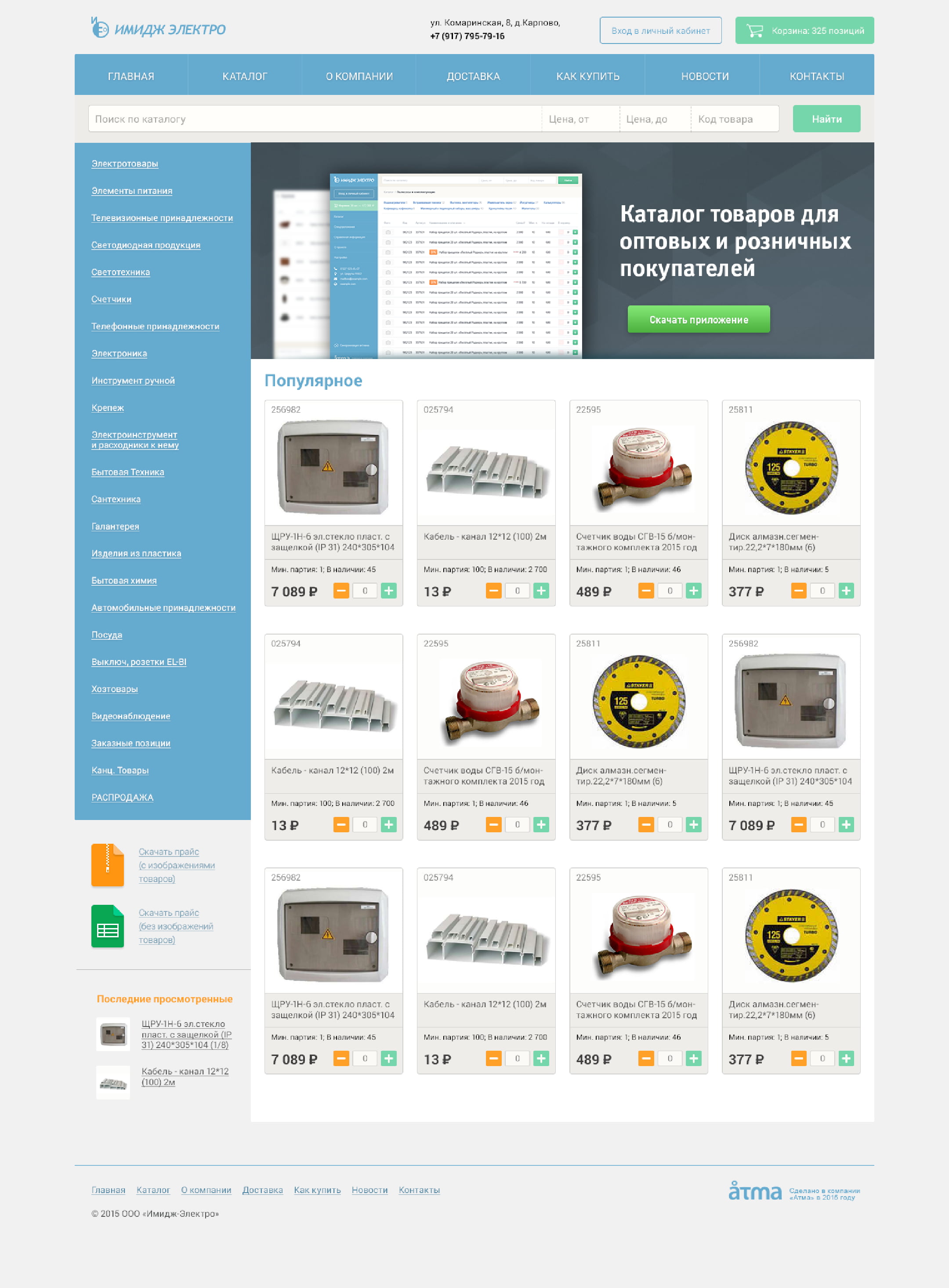 Интернет-магазин «Имидж электро»Компания «Имидж Электро» занимается оптовыми продажами электротехнической продукции, сантехники, садового инвентаря, бытовой техники. За 15 лет работы накопилась база постоянных клиентов и постоянно появляются новые. Каталог компании «Имидж Электро» насчитывает около 9 тысяч наименований товаров.