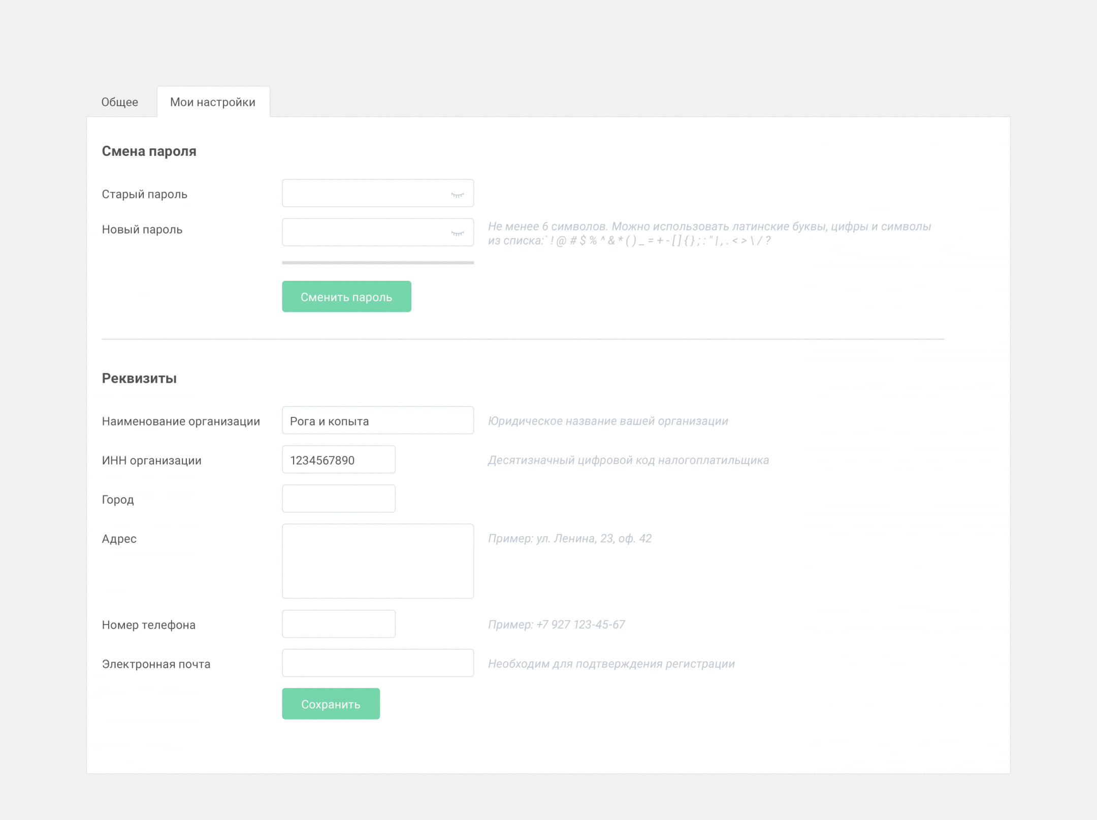 ![]() Вкладка с настройками, где мы можем изменить пароль, реквизиты и контактную информацию.